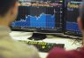 Journalists pose looking at a computer screen with the Bloomberg display showing a three-day view showing the rise and fall in the value of the pound sterling against the US dollar in London on October…